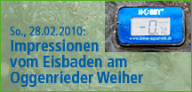 In der Mitte des Sees betrug die Eisdicke etwa 25 Zentimeter. Trotzdem, oder vielleicht gerade deswegen, fanden sich einige Mutige beiderlei Geschlechts am Sonntag am DAV Vereinszentrum in Kaufbeuren ein, um gemeinsam eine Stunde zum Oggenrieder Weiher bei Irsee zu wandern. Doch am Ziel angekommen begann die Aufregung erst. Der Wind wehte und das Thermometer im Wasser zeigte beinahe ein Grad Minus an. Doch weder Wind, noch Wolken oder Kälte konnten die Eisbader davon abhalten, sich gemeinsam in den See zu stürzen.
