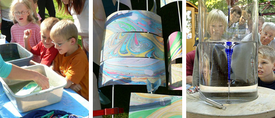 Kinder zaubern in der Marmorierwerkstatt mit Wasser, Farbe und Papier